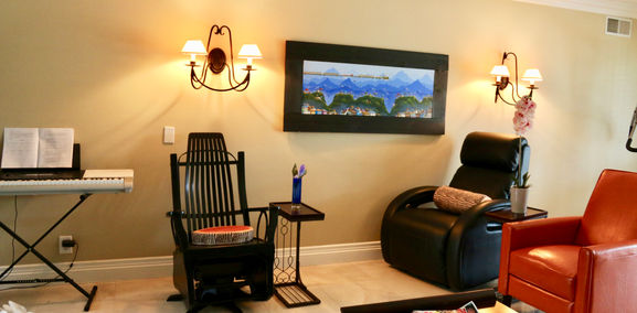 The living room is tastefully furnished with brand new comfortable leather chairs as well as soothing rocking chairs.